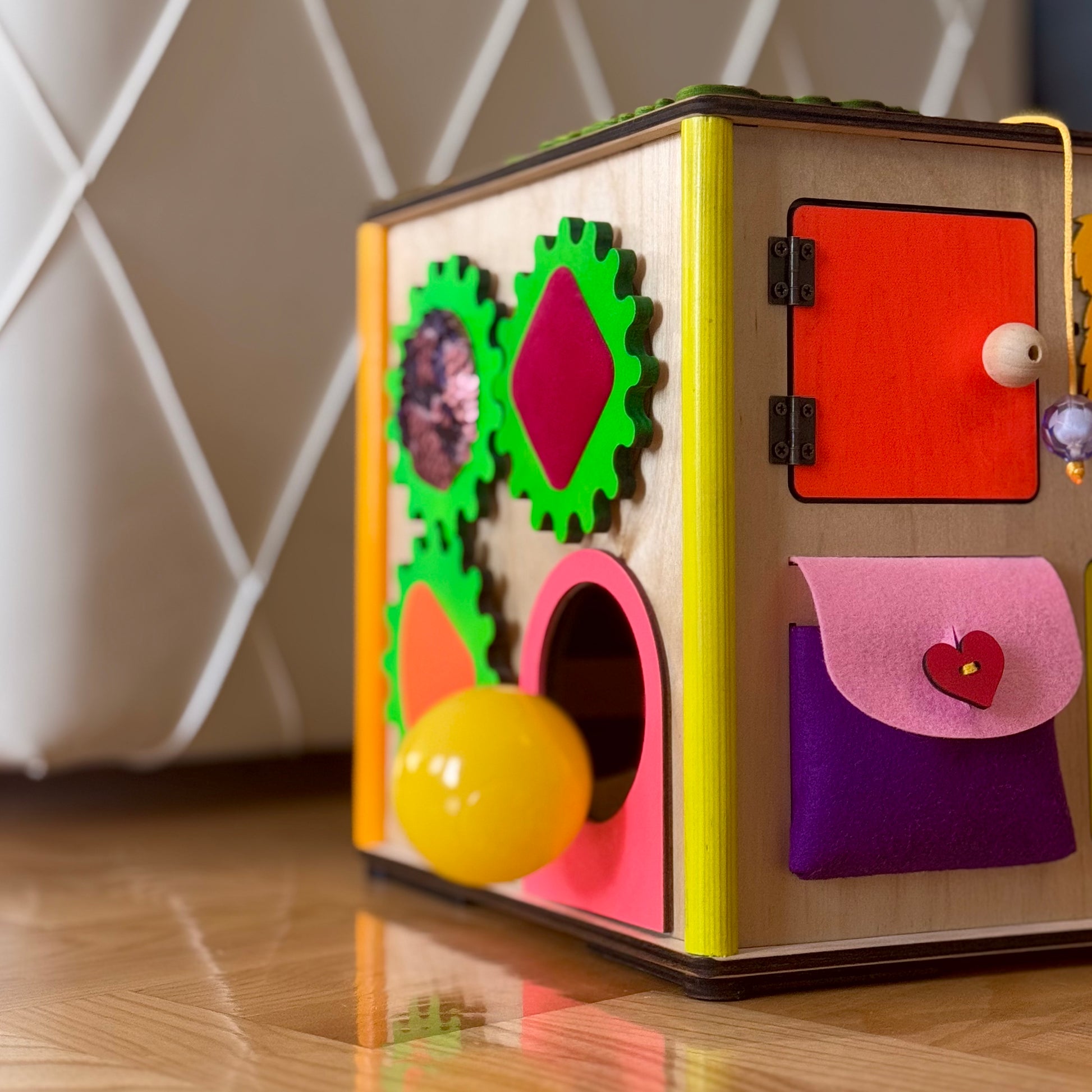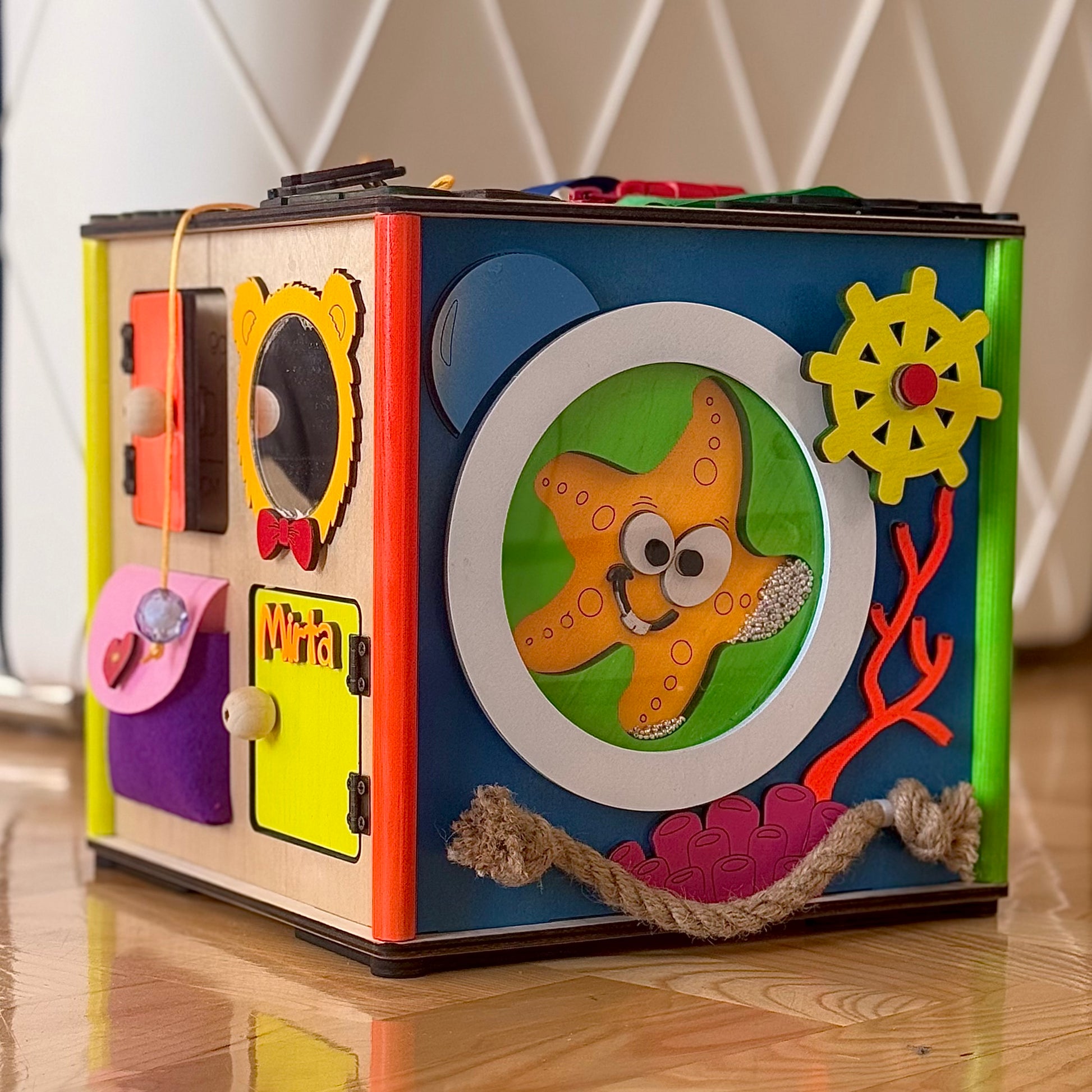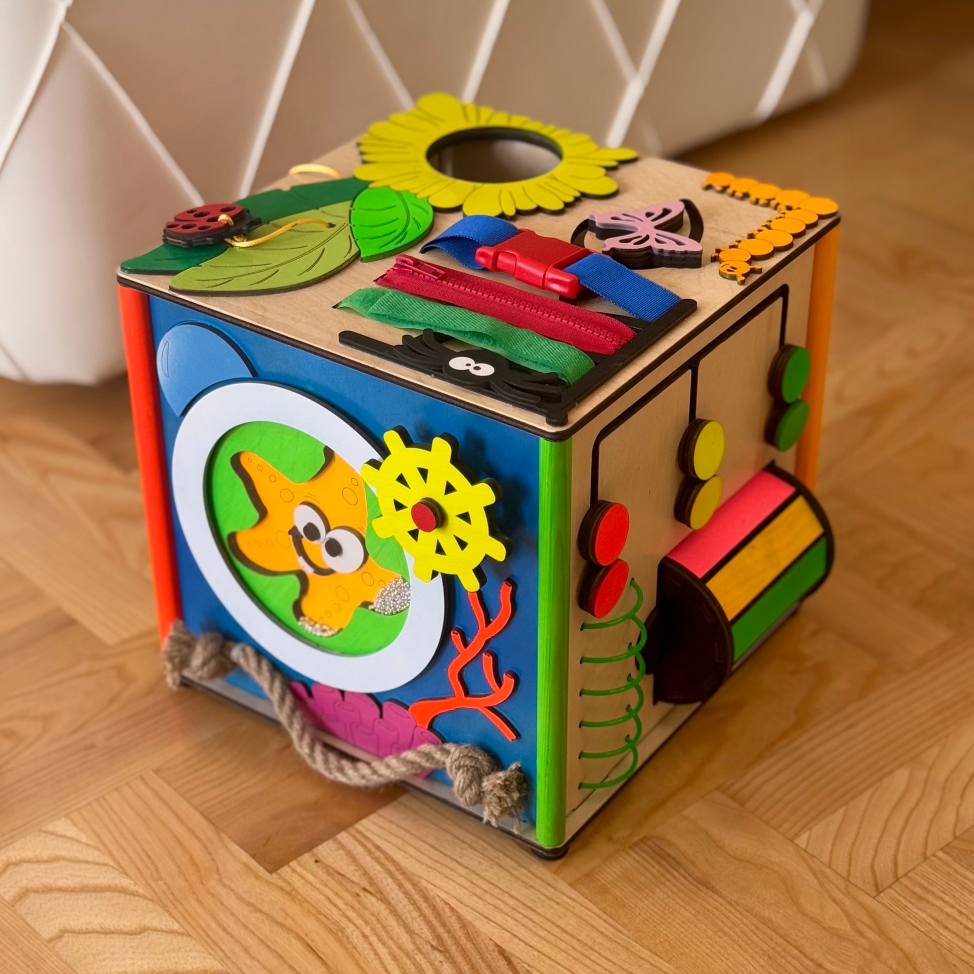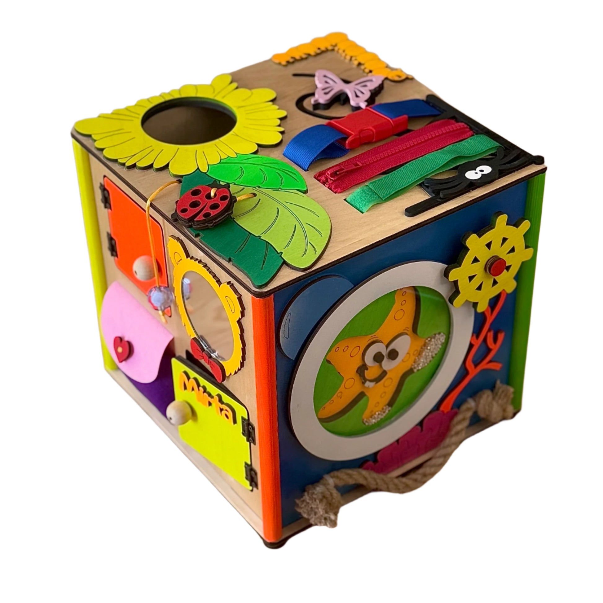 Pametna Montesori kocka je idealna zabava za bebe od 6 meseci. Svaka od pet strana je jedinstvena i zanimljiva, pružajući mnoštvo mogućnosti za igru i učenje. Zvučni zupčanici sa različitim teksturama pomažu u razvoju taktičkih veština i slušnog opažanja deteta. Čičak, rajsferšlus i kopča doprinose razvoju fine motorike i koordinacije pokreta. Zvučni bubanj i vrteška sa biserom u obliku veselog morske zvezde privlače pažnju deteta, razvijajući njegove vizuelne i motoričke veštine. Mala vrata skrivaju porodičnu fotografiju, što doprinosi razvoju emocionalne povezanosti i percepcije deteta. Uz ogledalo u obliku mede dete prepoznaje svoj odraz i razvija samosvest. U kompletu dolazi loptica koja veselo iskače iznutra kocke, doprinoseći razvoju motorike i koordinacije pokreta deteta. Ova razvojna drvena kocka obećava da će biti ne samo izvor zabave, već i alat za učenje Vašeg mališana.