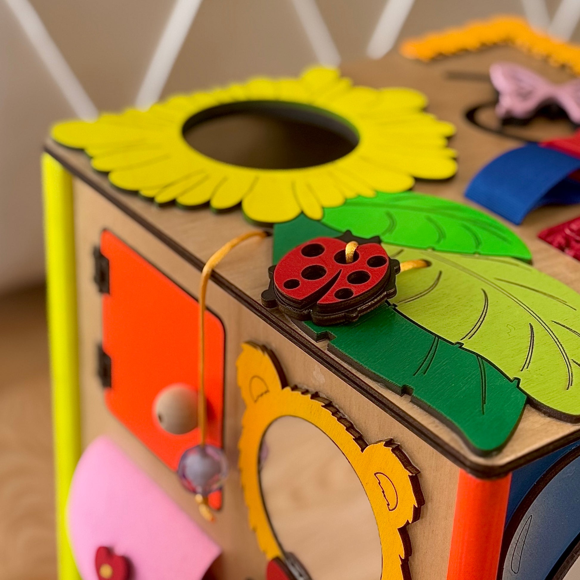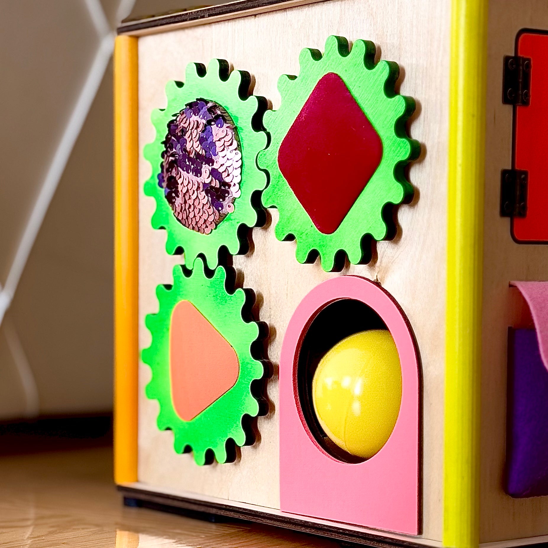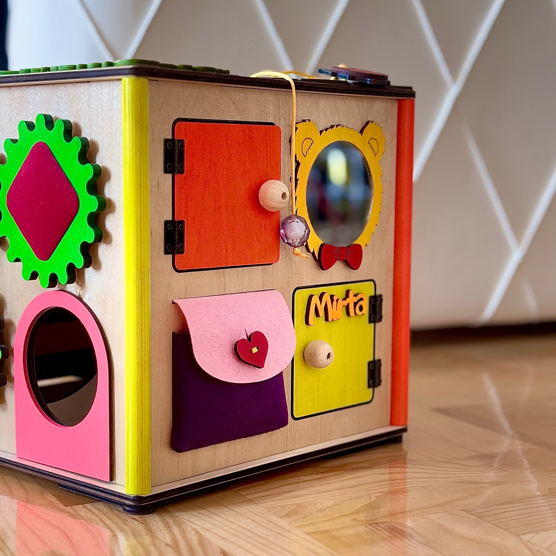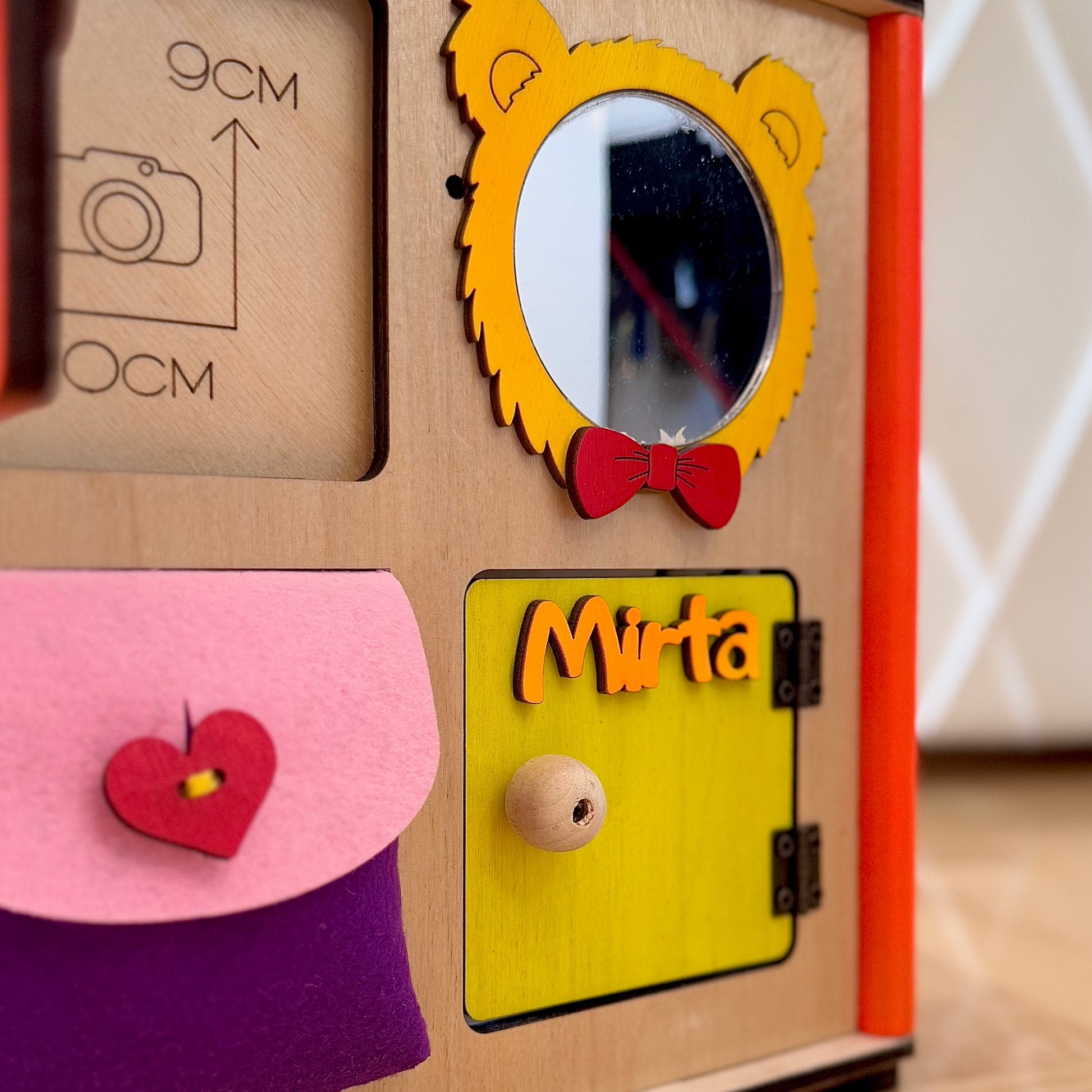 Pametna Montesori kocka je idealna zabava za bebe od 6 meseci. Svaka od pet strana je jedinstvena i zanimljiva, pružajući mnoštvo mogućnosti za igru i učenje. Zvučni zupčanici sa različitim teksturama pomažu u razvoju taktičkih veština i slušnog opažanja deteta. Čičak, rajsferšlus i kopča doprinose razvoju fine motorike i koordinacije pokreta. Zvučni bubanj i vrteška sa biserom u obliku veselog morske zvezde privlače pažnju deteta, razvijajući njegove vizuelne i motoričke veštine. Mala vrata skrivaju porodičnu fotografiju, što doprinosi razvoju emocionalne povezanosti i percepcije deteta. Uz ogledalo u obliku mede dete prepoznaje svoj odraz i razvija samosvest. U kompletu dolazi loptica koja veselo iskače iznutra kocke, doprinoseći razvoju motorike i koordinacije pokreta deteta. Ova razvojna drvena kocka obećava da će biti ne samo izvor zabave, već i alat za učenje Vašeg mališana.