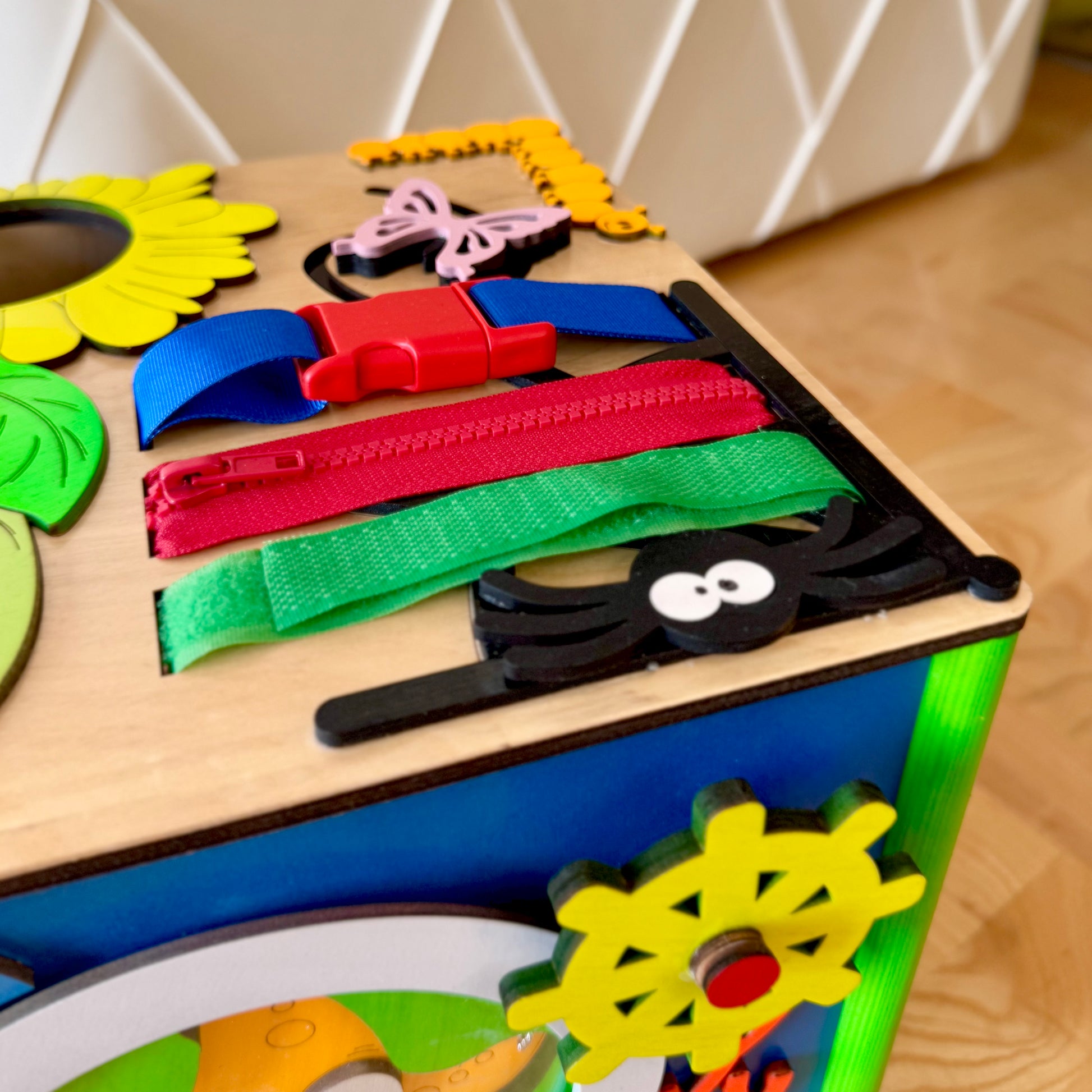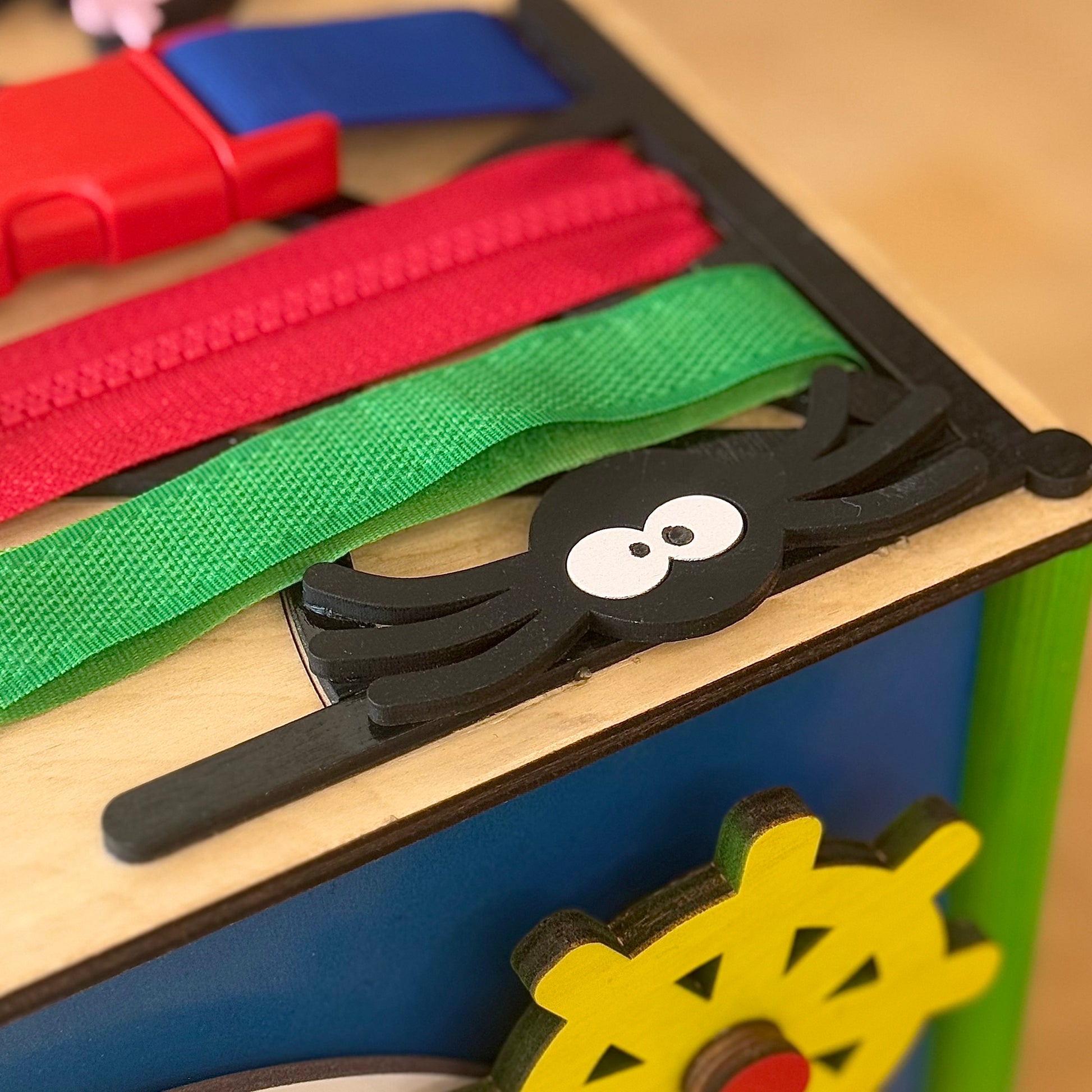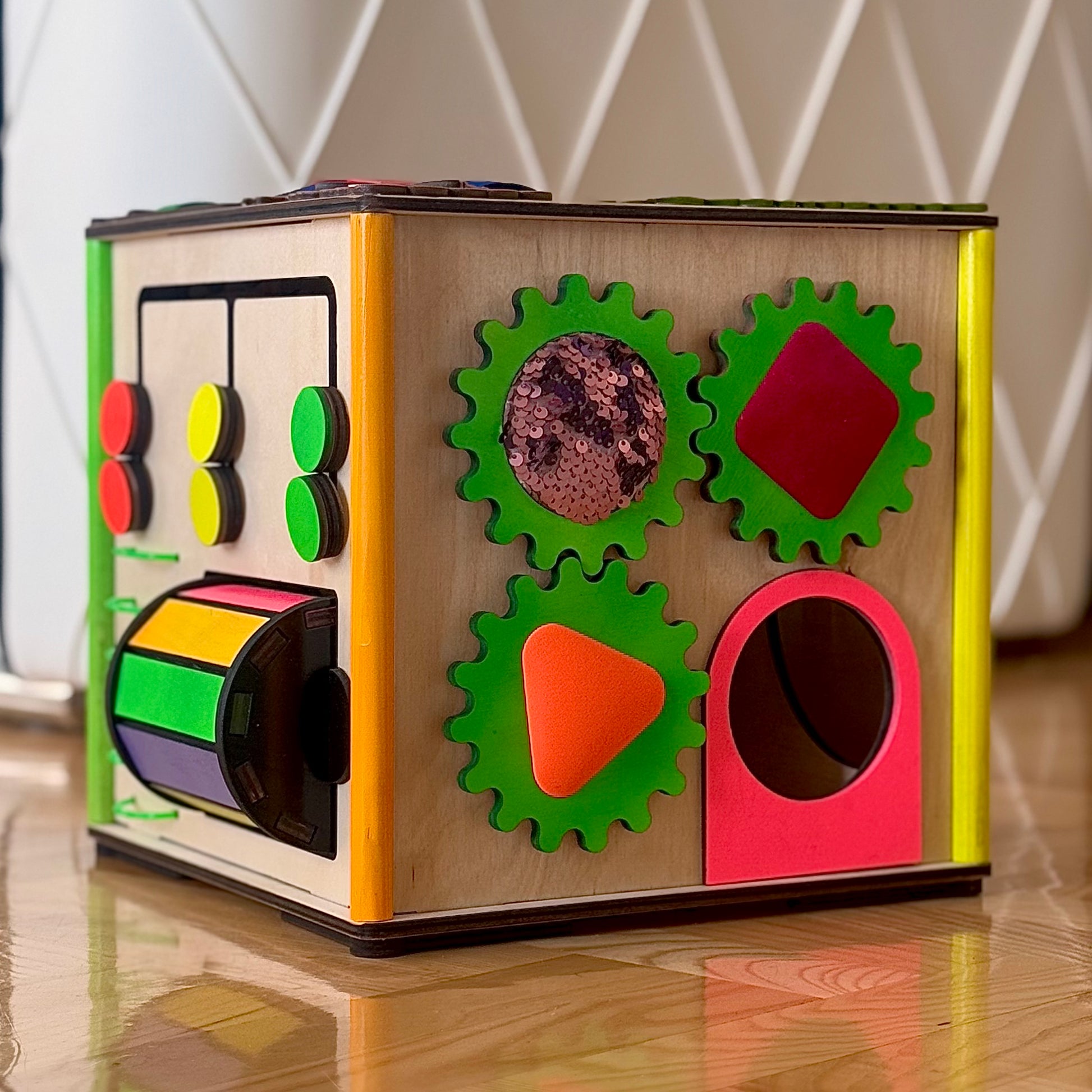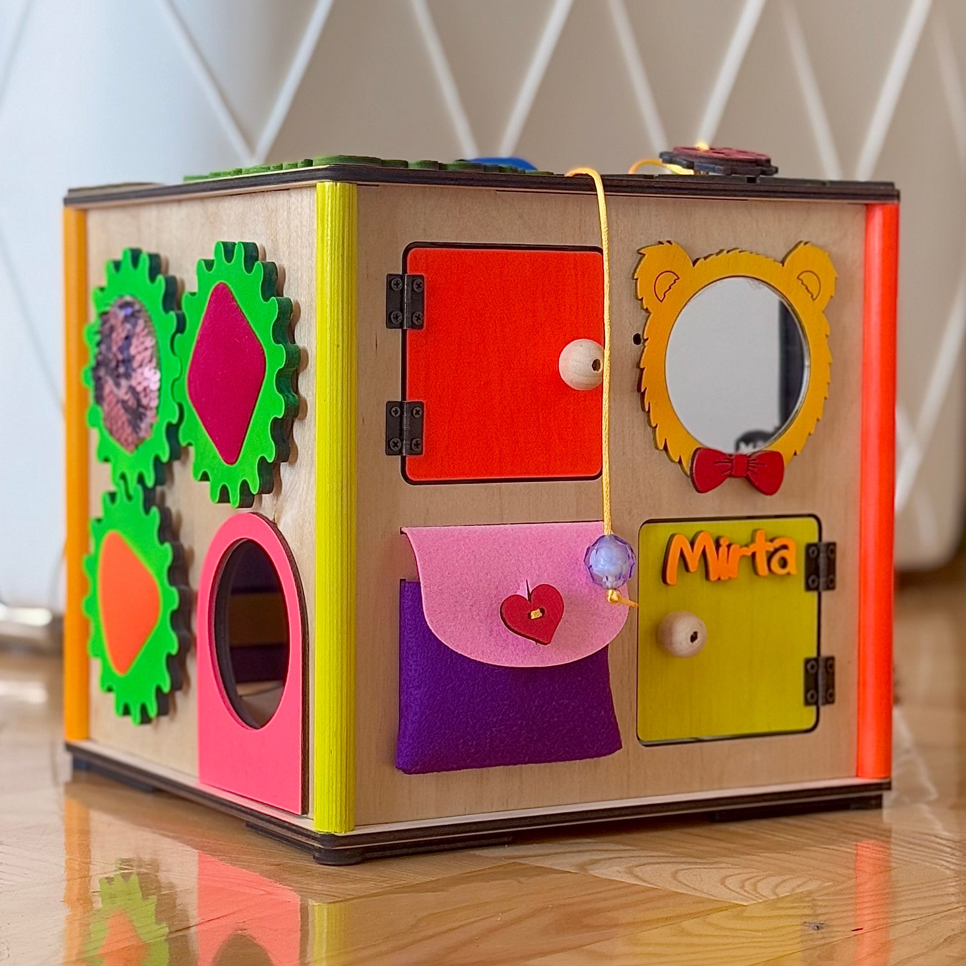Pametna Montesori kocka je idealna zabava za bebe od 6 meseci. Svaka od pet strana je jedinstvena i zanimljiva, pružajući mnoštvo mogućnosti za igru i učenje. Zvučni zupčanici sa različitim teksturama pomažu u razvoju taktičkih veština i slušnog opažanja deteta. Čičak, rajsferšlus i kopča doprinose razvoju fine motorike i koordinacije pokreta. Zvučni bubanj i vrteška sa biserom u obliku veselog morske zvezde privlače pažnju deteta, razvijajući njegove vizuelne i motoričke veštine. Mala vrata skrivaju porodičnu fotografiju, što doprinosi razvoju emocionalne povezanosti i percepcije deteta. Uz ogledalo u obliku mede dete prepoznaje svoj odraz i razvija samosvest. U kompletu dolazi loptica koja veselo iskače iznutra kocke, doprinoseći razvoju motorike i koordinacije pokreta deteta. Ova razvojna drvena kocka obećava da će biti ne samo izvor zabave, već i alat za učenje Vašeg mališana.