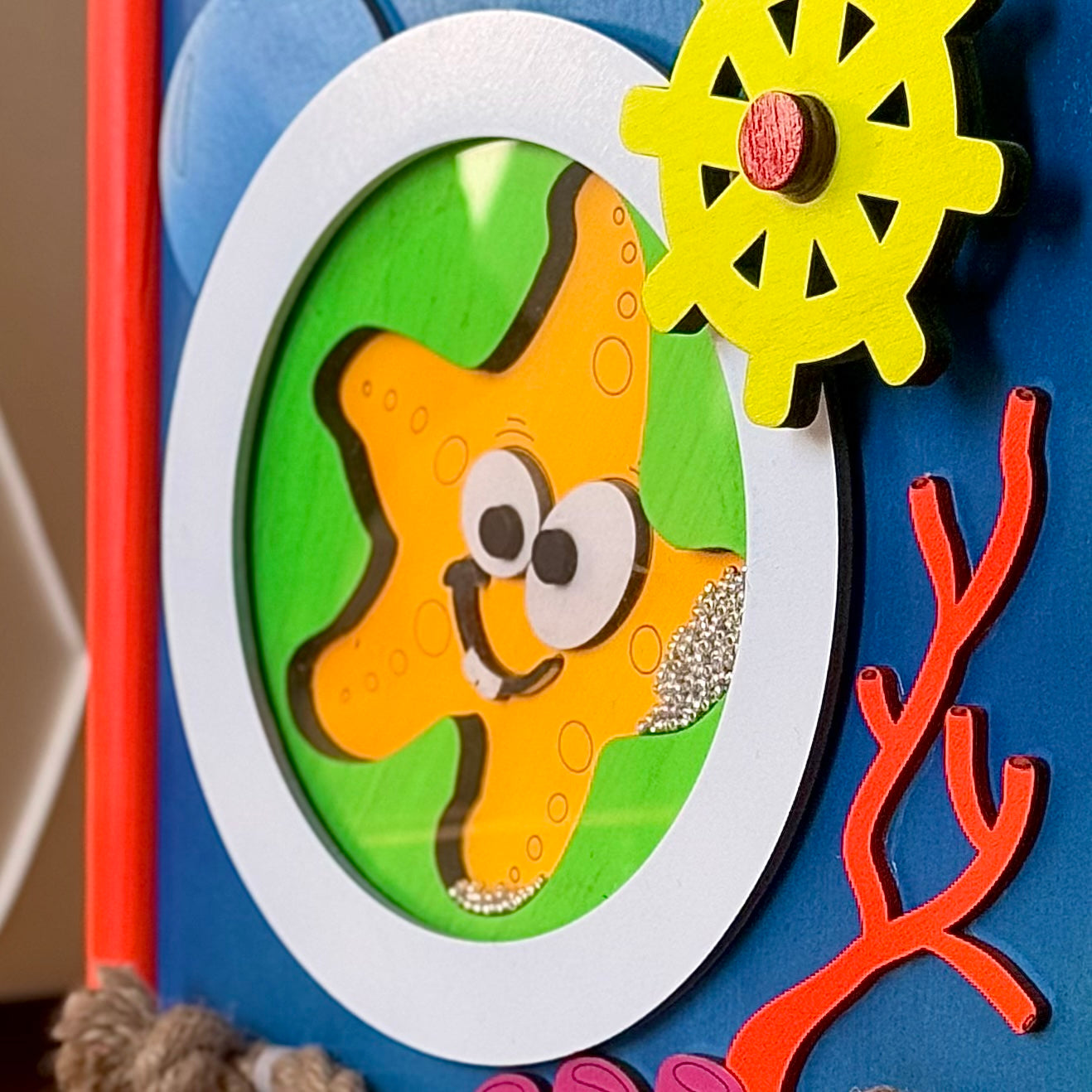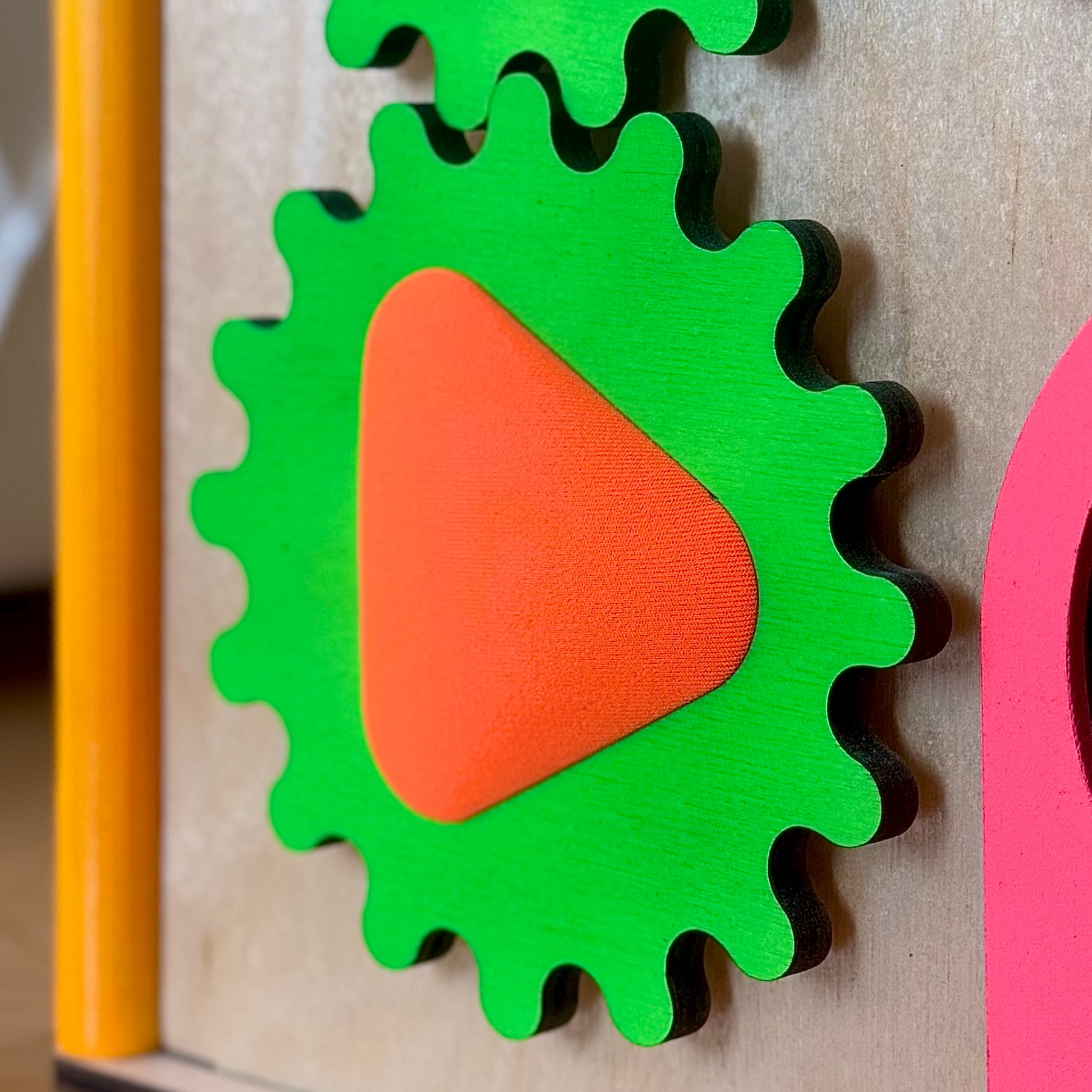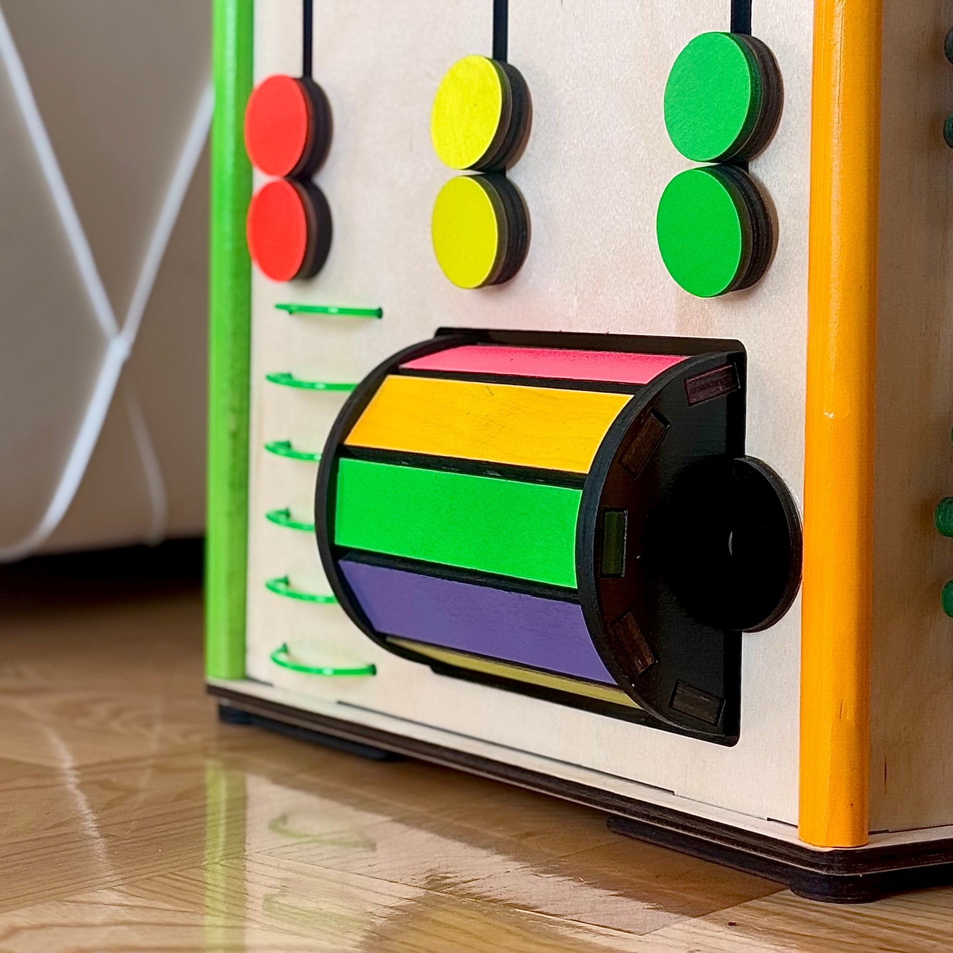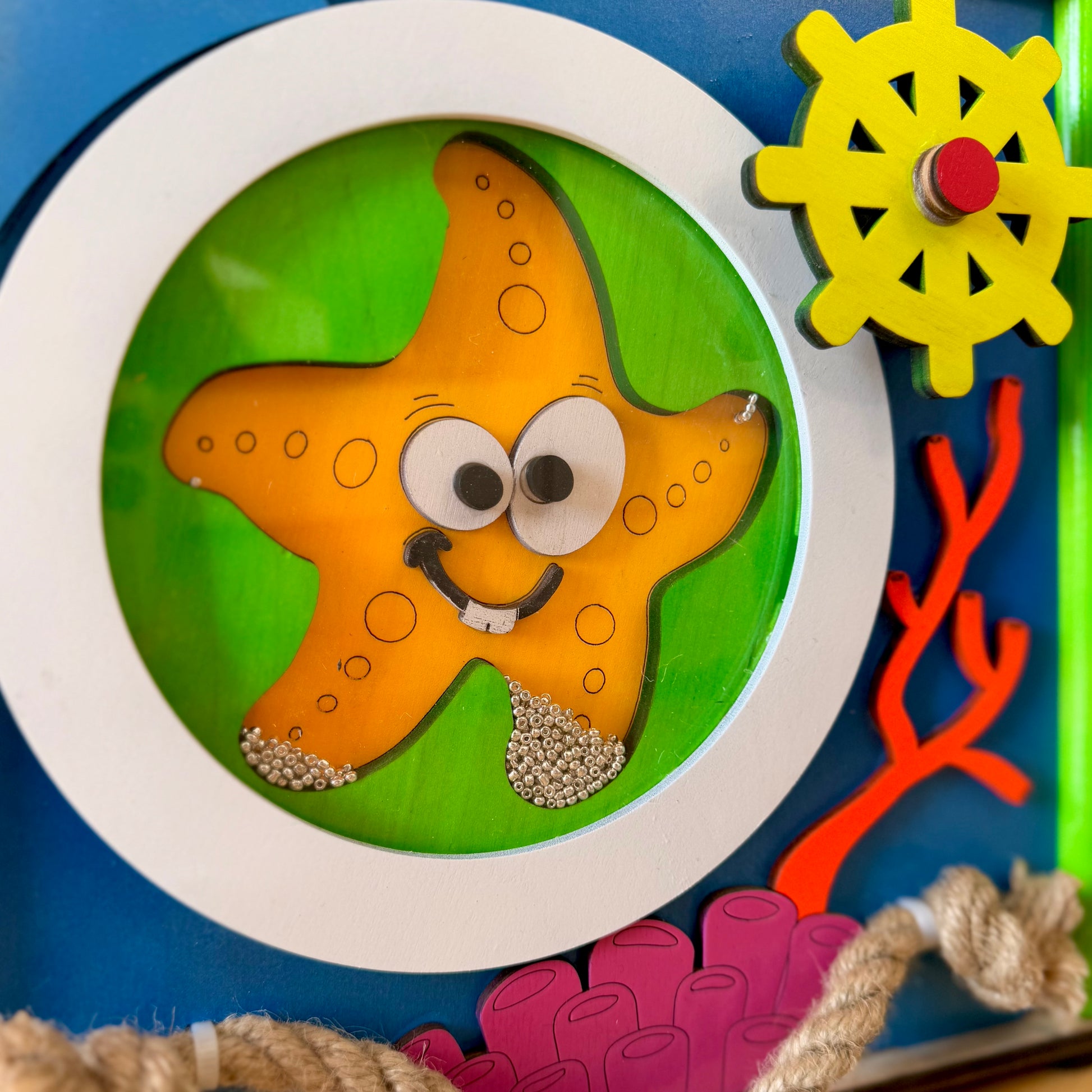 Pametna Montesori kocka je idealna zabava za bebe od 6 meseci. Svaka od pet strana je jedinstvena i zanimljiva, pružajući mnoštvo mogućnosti za igru i učenje. Zvučni zupčanici sa različitim teksturama pomažu u razvoju taktičkih veština i slušnog opažanja deteta. Čičak, rajsferšlus i kopča doprinose razvoju fine motorike i koordinacije pokreta. Zvučni bubanj i vrteška sa biserom u obliku veselog morske zvezde privlače pažnju deteta, razvijajući njegove vizuelne i motoričke veštine. Mala vrata skrivaju porodičnu fotografiju, što doprinosi razvoju emocionalne povezanosti i percepcije deteta. Uz ogledalo u obliku mede dete prepoznaje svoj odraz i razvija samosvest. U kompletu dolazi loptica koja veselo iskače iznutra kocke, doprinoseći razvoju motorike i koordinacije pokreta deteta. Ova razvojna drvena kocka obećava da će biti ne samo izvor zabave, već i alat za učenje Vašeg mališana.
