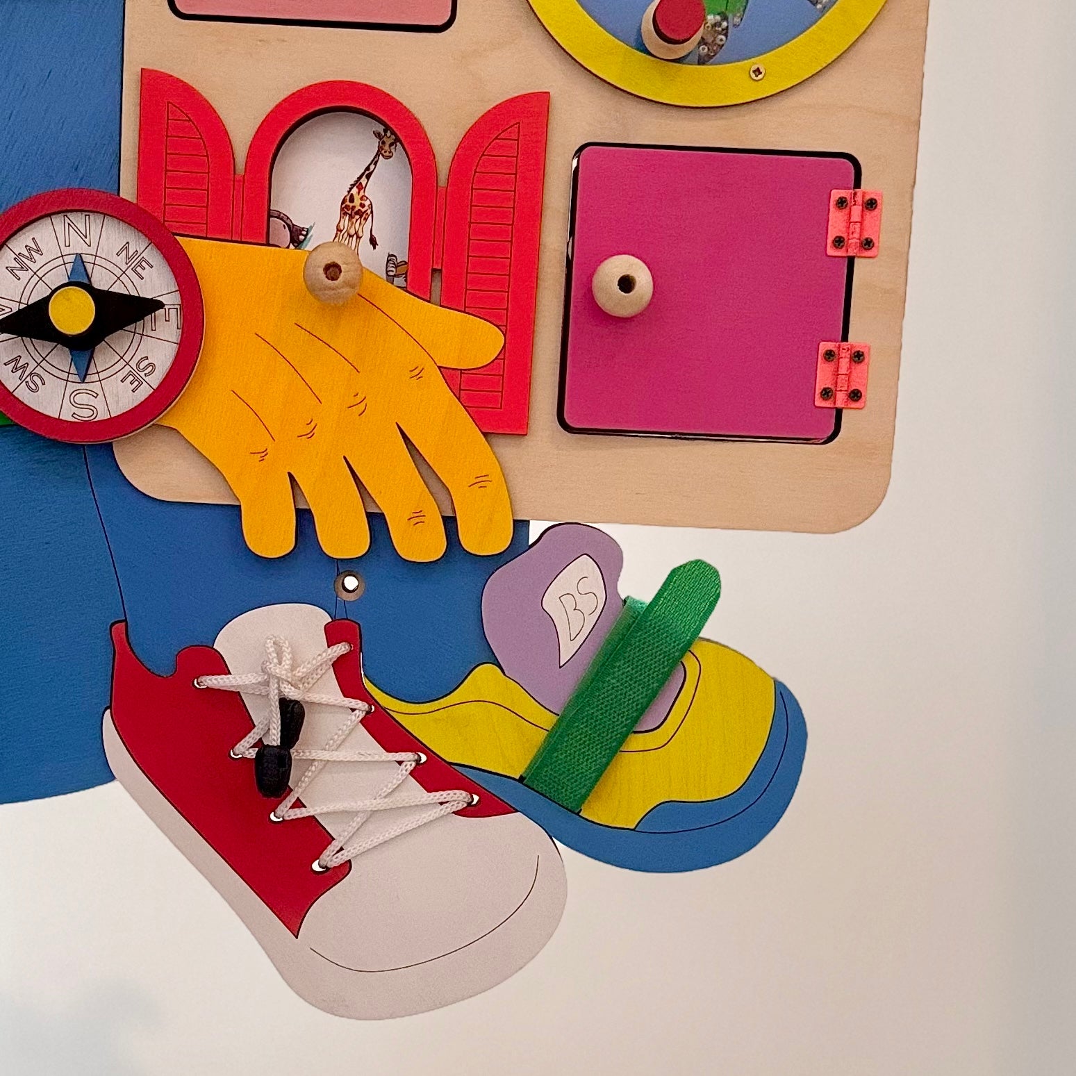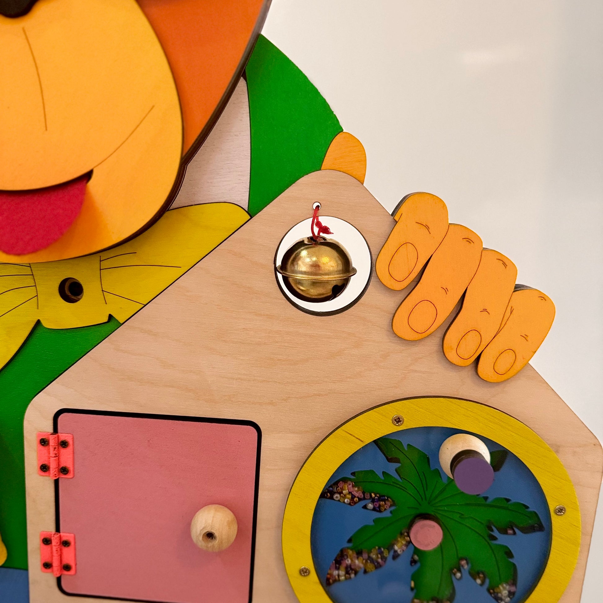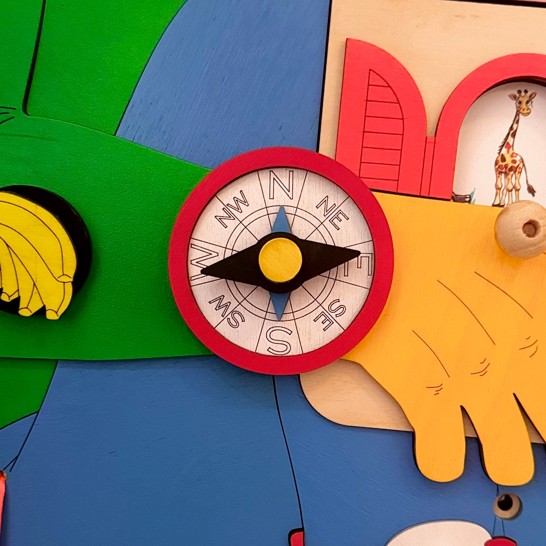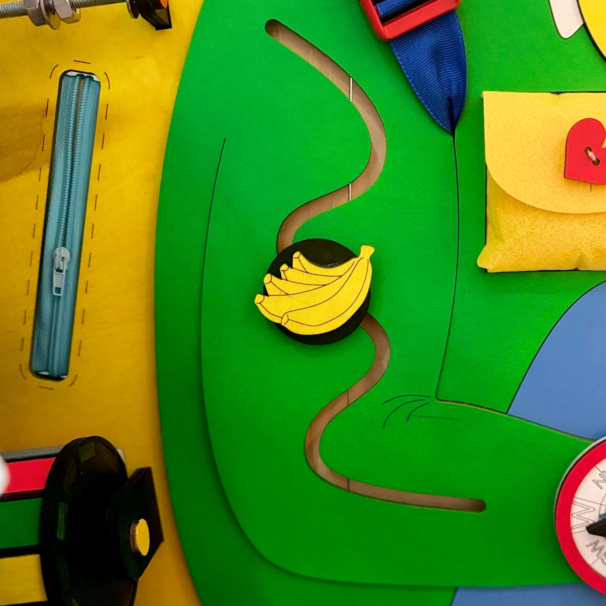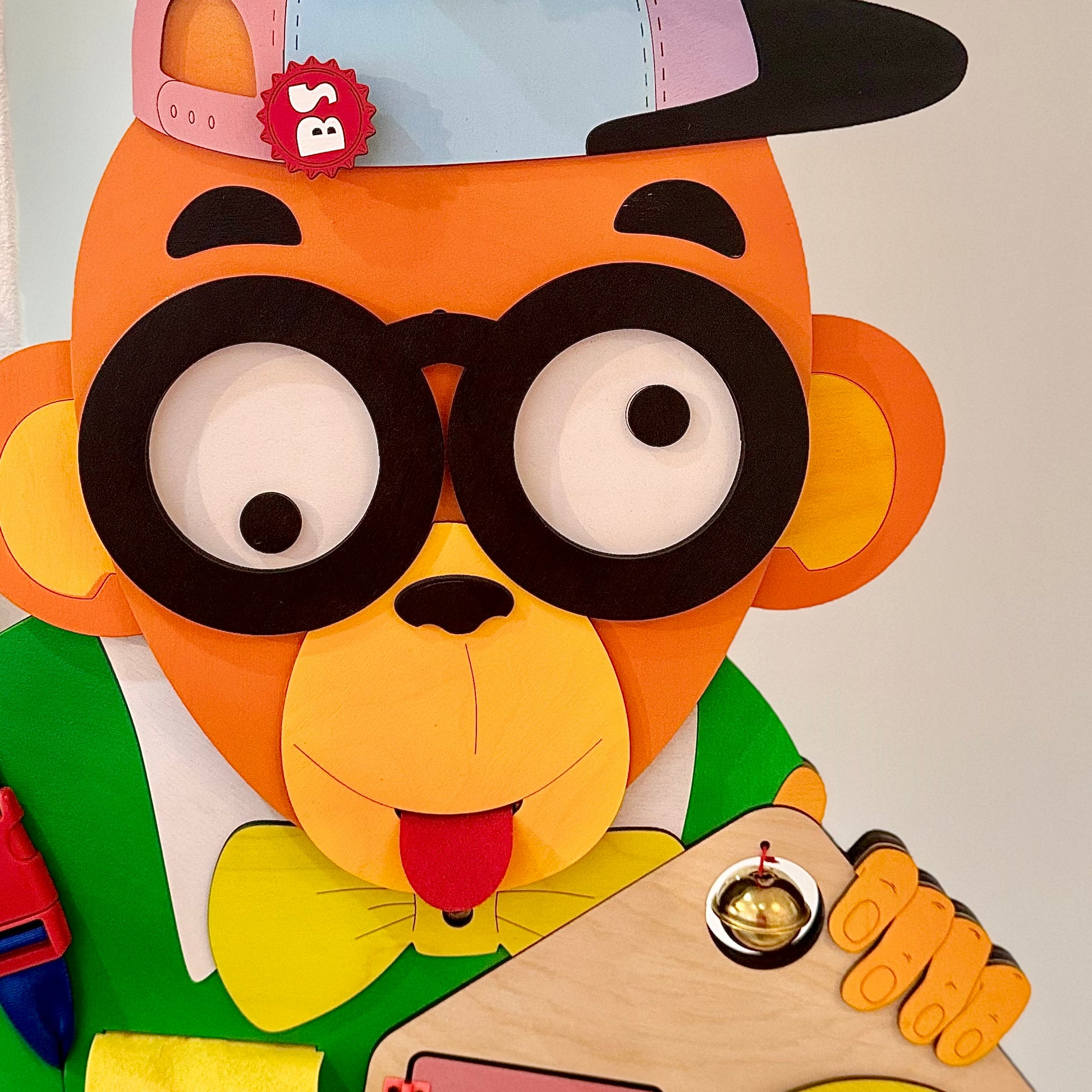 Edukativna tabla Montesori (busy board) u obliku veselog majmunčića, što odmah privlači pažnju dece svih uzrasta. Prilikom izrade, uzeli smo u obzir sve osnovne elemente za razvoj motorike, logičkog razmišljanja i mašte. Pristupili smo kreativnoj izradi kako bi bila ne samo korisna i zabavna, već i da se uklopi u svaki enterijer.