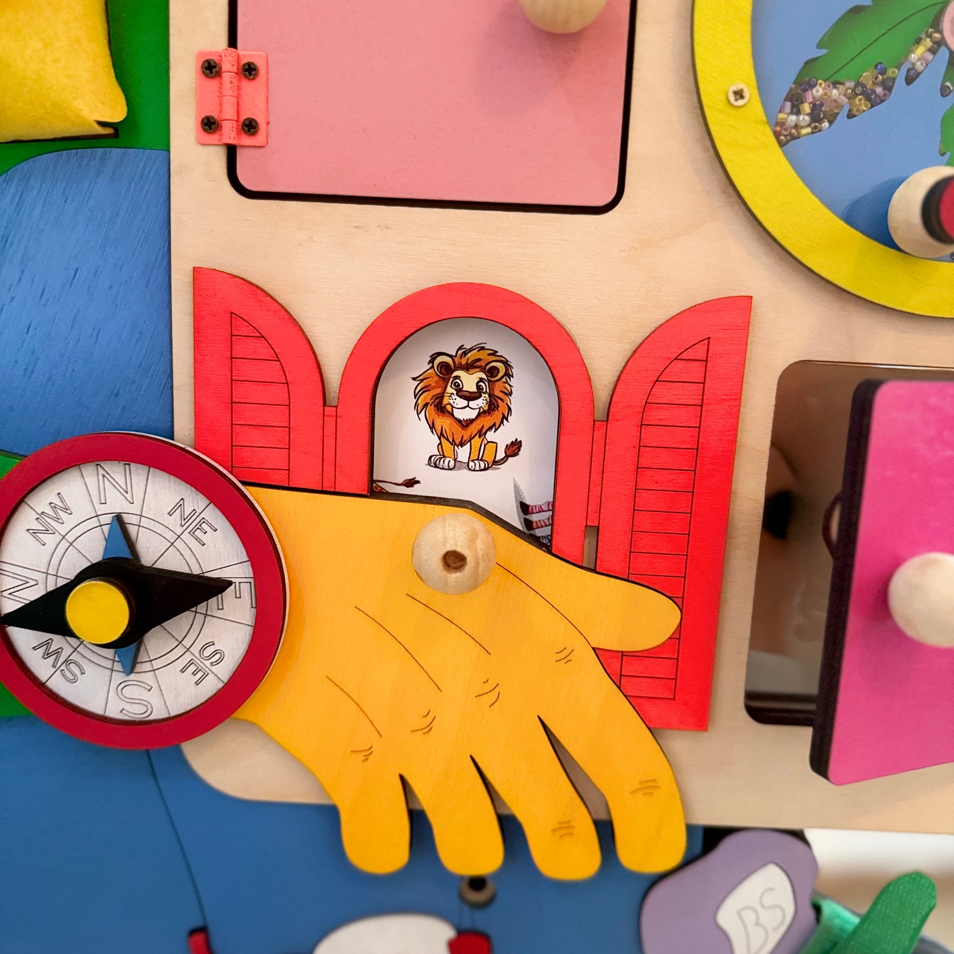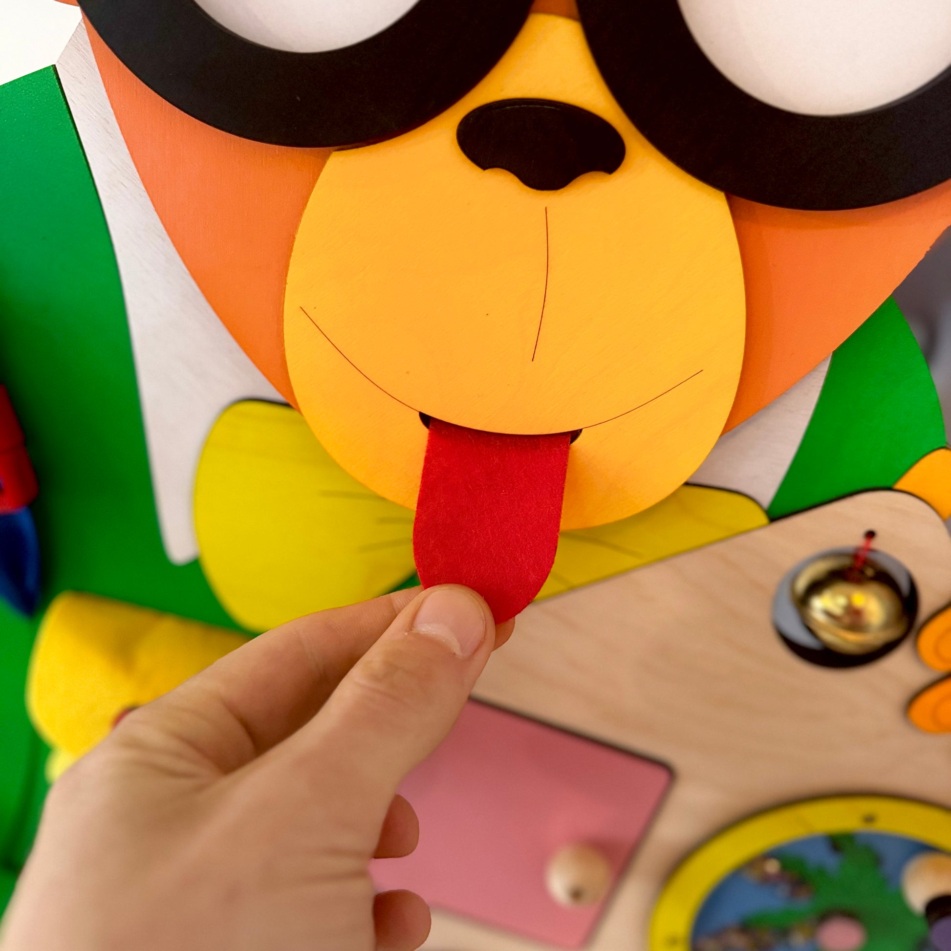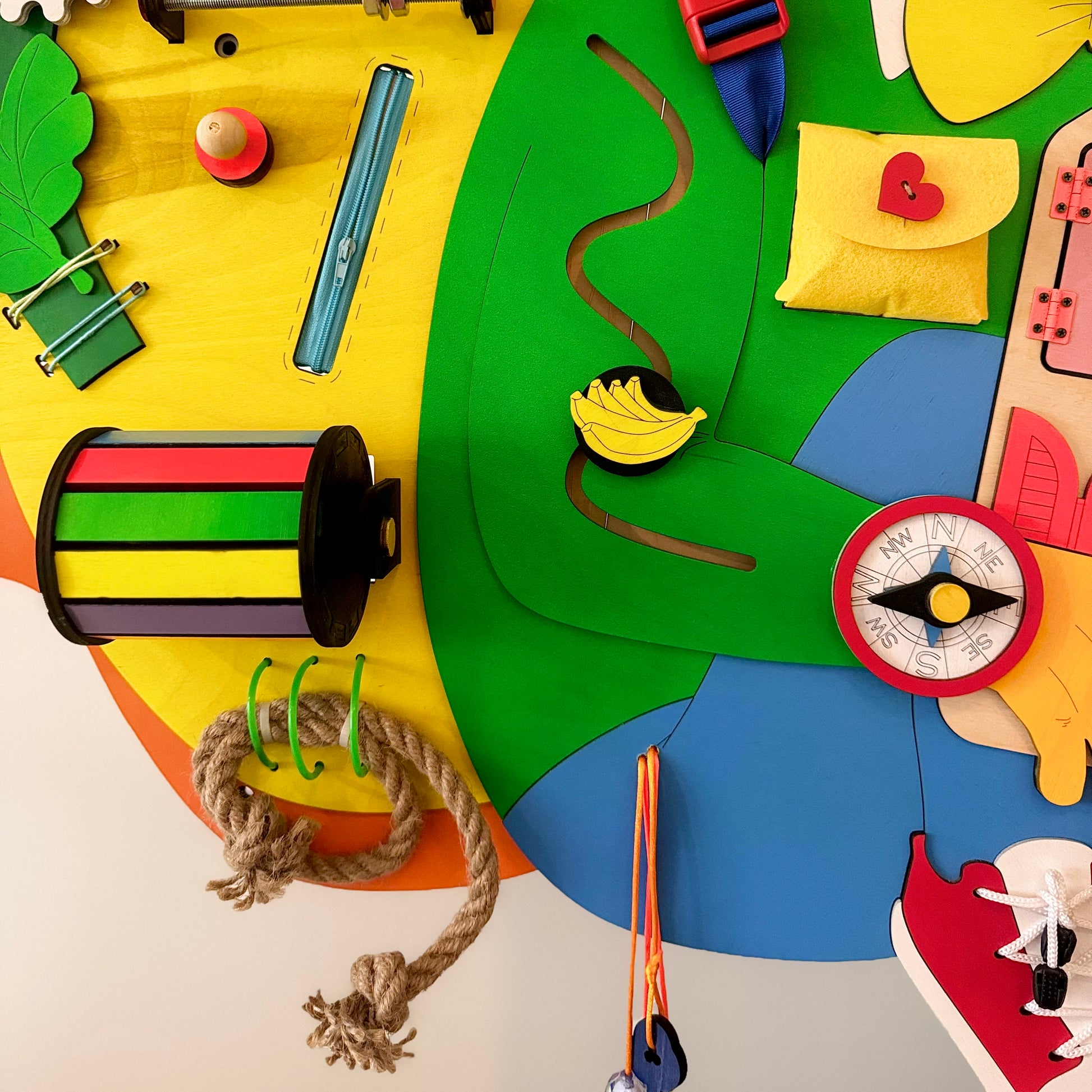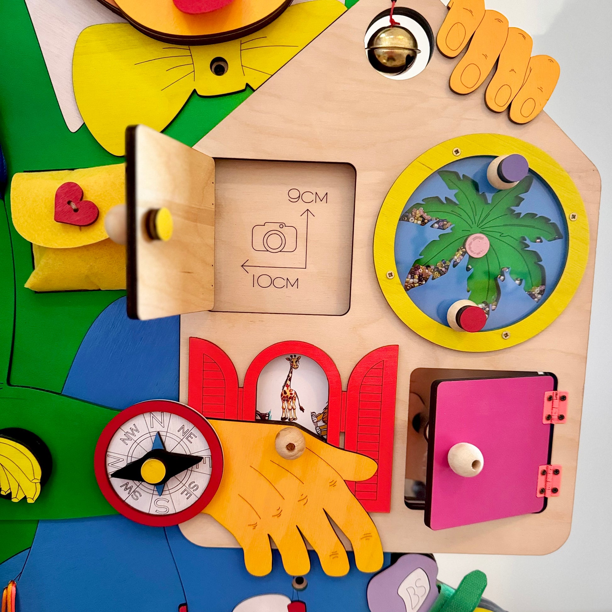 Edukativna tabla Montesori (busy board) u obliku veselog majmunčića, što odmah privlači pažnju dece svih uzrasta. Prilikom izrade, uzeli smo u obzir sve osnovne elemente za razvoj motorike, logičkog razmišljanja i mašte. Pristupili smo kreativnoj izradi kako bi bila ne samo korisna i zabavna, već i da se uklopi u svaki enterijer.